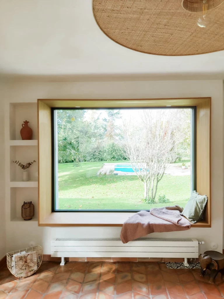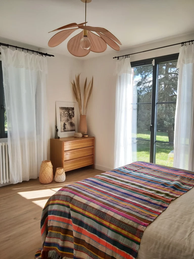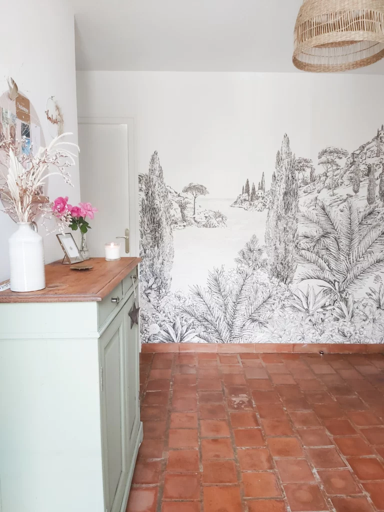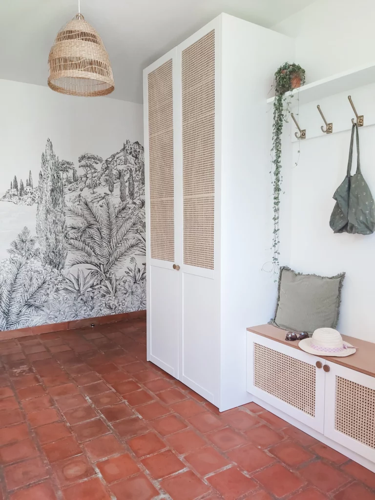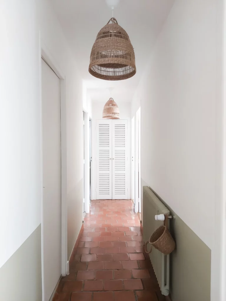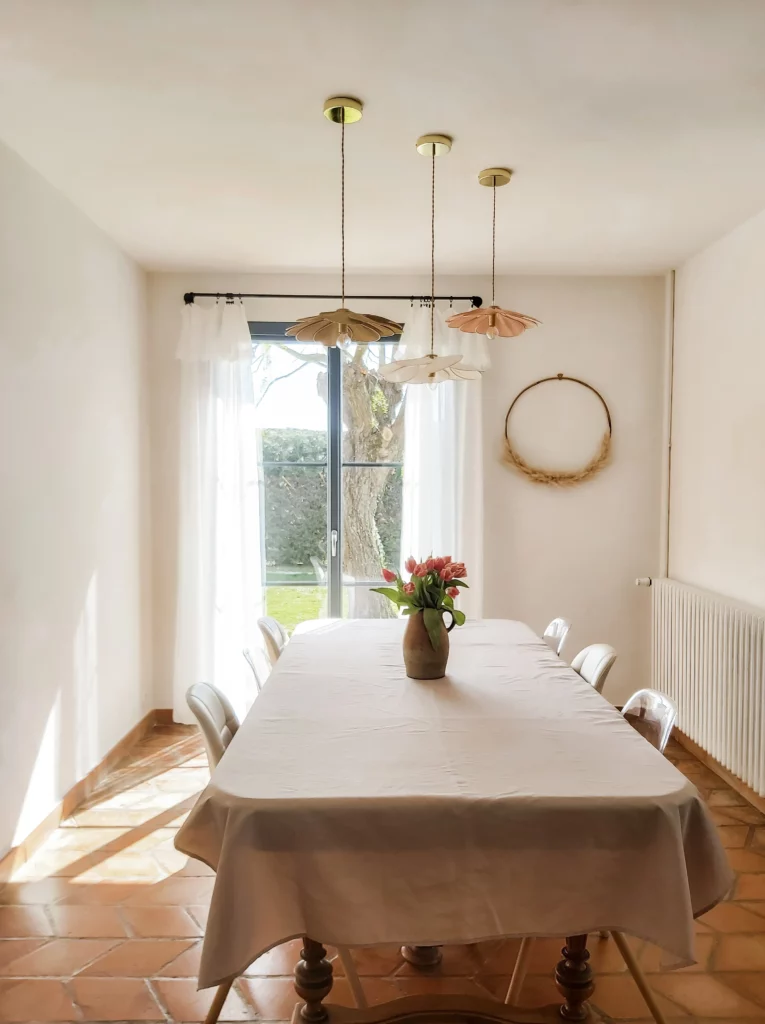 Un mas provençal en Isère, construit en pleine nature dans les années 1970 … voilà de quoi faire travailler mon imagination pour créer une ambiance singulière et ultra personnalisée ! Ici nous avons : conservé les tomettes en terre cuite au sol pour leur authenticité et leur chaleur, apporter de la lumière dans chaque pièce, allégé visuellement chaque espace pour mettre en valeur la vue sur le parc extérieur, intégré des rangements pratiques pour toute la famille. Du coté des couleurs, nous avons associés du blanc, du vert, du beige, du rose et du bleu aux sols en terre cuite ou en liège et dans les éléments décoratifs, mixés un peu de provence, d’esprit 1970 et de souvenirs personnels de voyage.