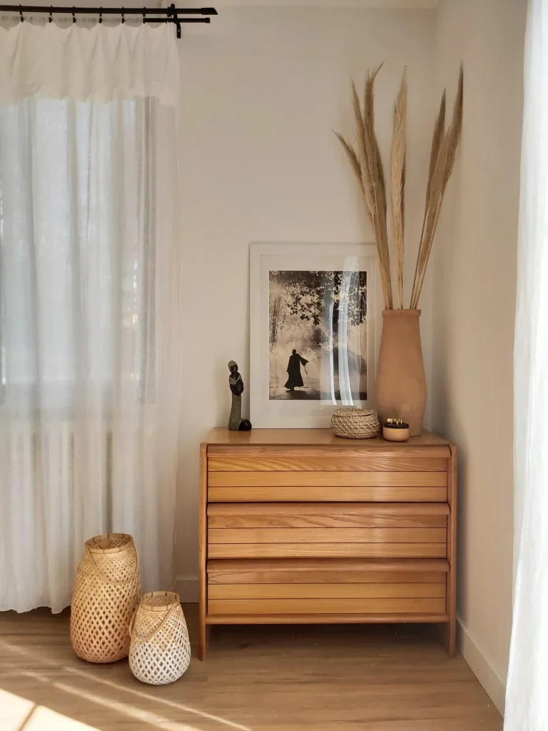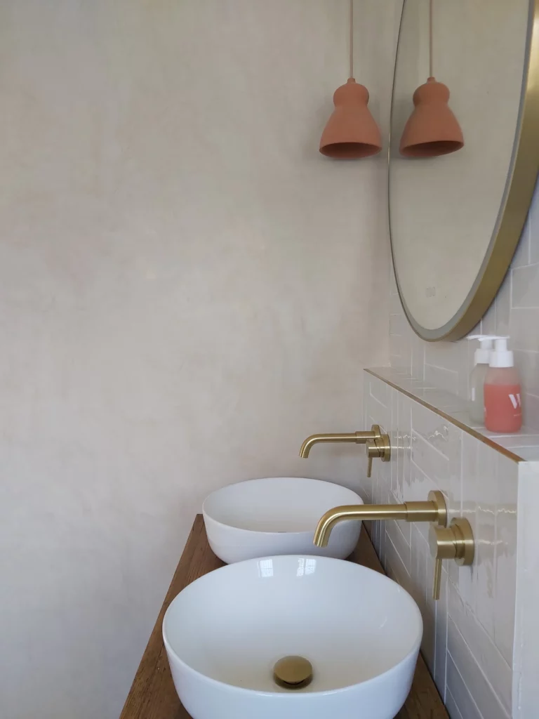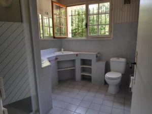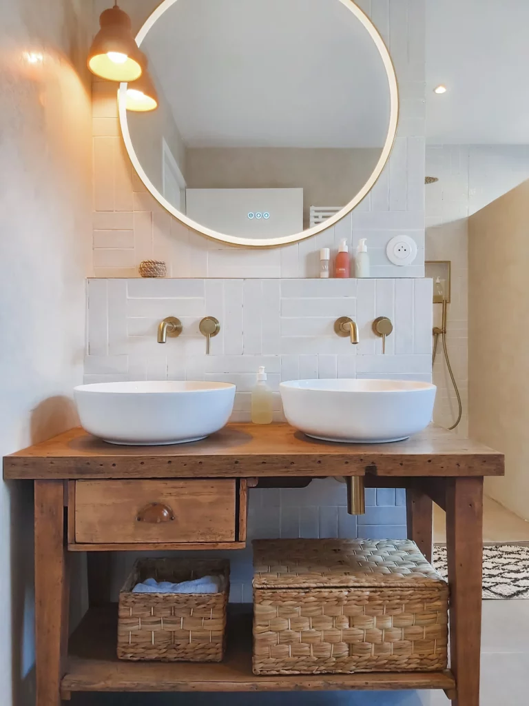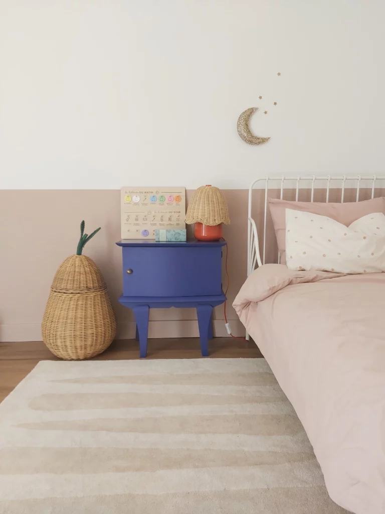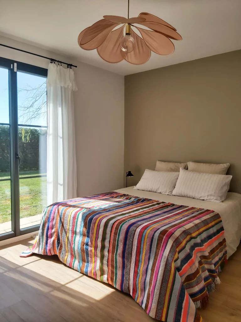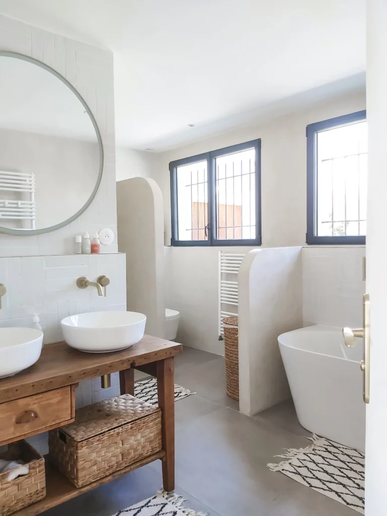 Un mas provençal en Isère, construit en pleine nature dans les années 1970 … voilà de quoi faire travailler mon imagination pour créer une ambiance singulière et ultra personnalisée ! Ici nous avons : conservé les tomettes en terre cuite au sol pour leur authenticité et leur chaleur, apporter de la lumière dans chaque pièce, allégé visuellement chaque espace pour mettre en valeur la vue sur le parc extérieur, intégré des rangements pratiques pour toute la famille. Du coté des couleurs, nous avons associés du blanc, du vert, du beige, du rose et du bleu aux sols en terre cuite ou en liège et dans les éléments décoratifs, mixés un peu de provence, d’esprit 1970 et de souvenirs personnels de voyage.