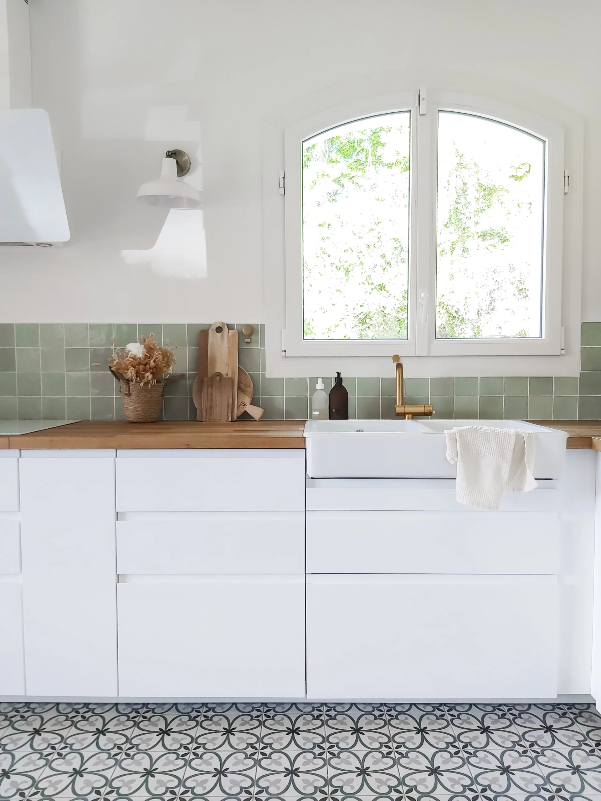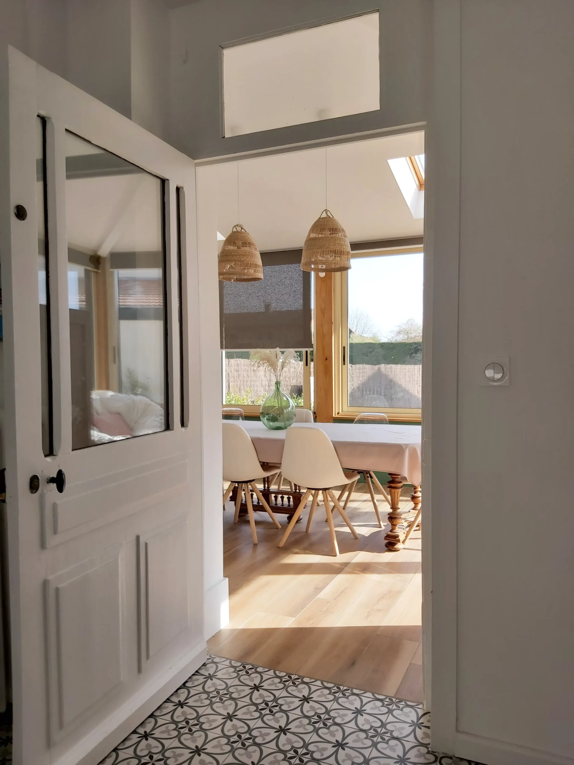 Le rez-de-chaussée a été complètement repensé. Le sol associe un carrelage effet parquet, chaleureux et intemporel, et des carreaux de ciment en rappel de l’époque de la maison. Cette combinaison crée une identité forte, tout en guidant subtilement la circulation entre les espaces.